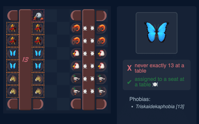 In this puzzle game you have the role of an Event Planner for the dinner of the Society of Multiphobics.